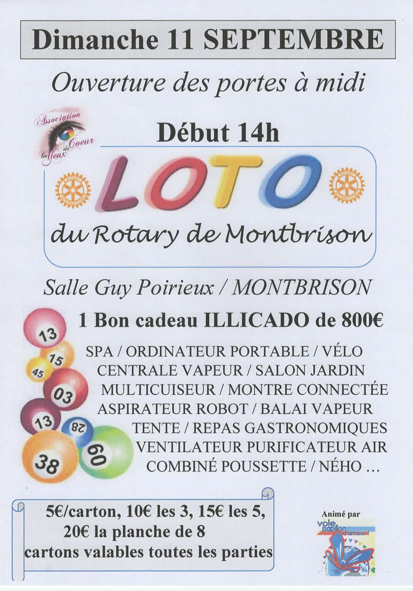 11 septembre 2022 salle Guy Poirieux de Montbrison à 14h: GRAND LOTO: Organisé par le Rotary club et l’association Vole papillon d’amour au profit des yeux du coeur: