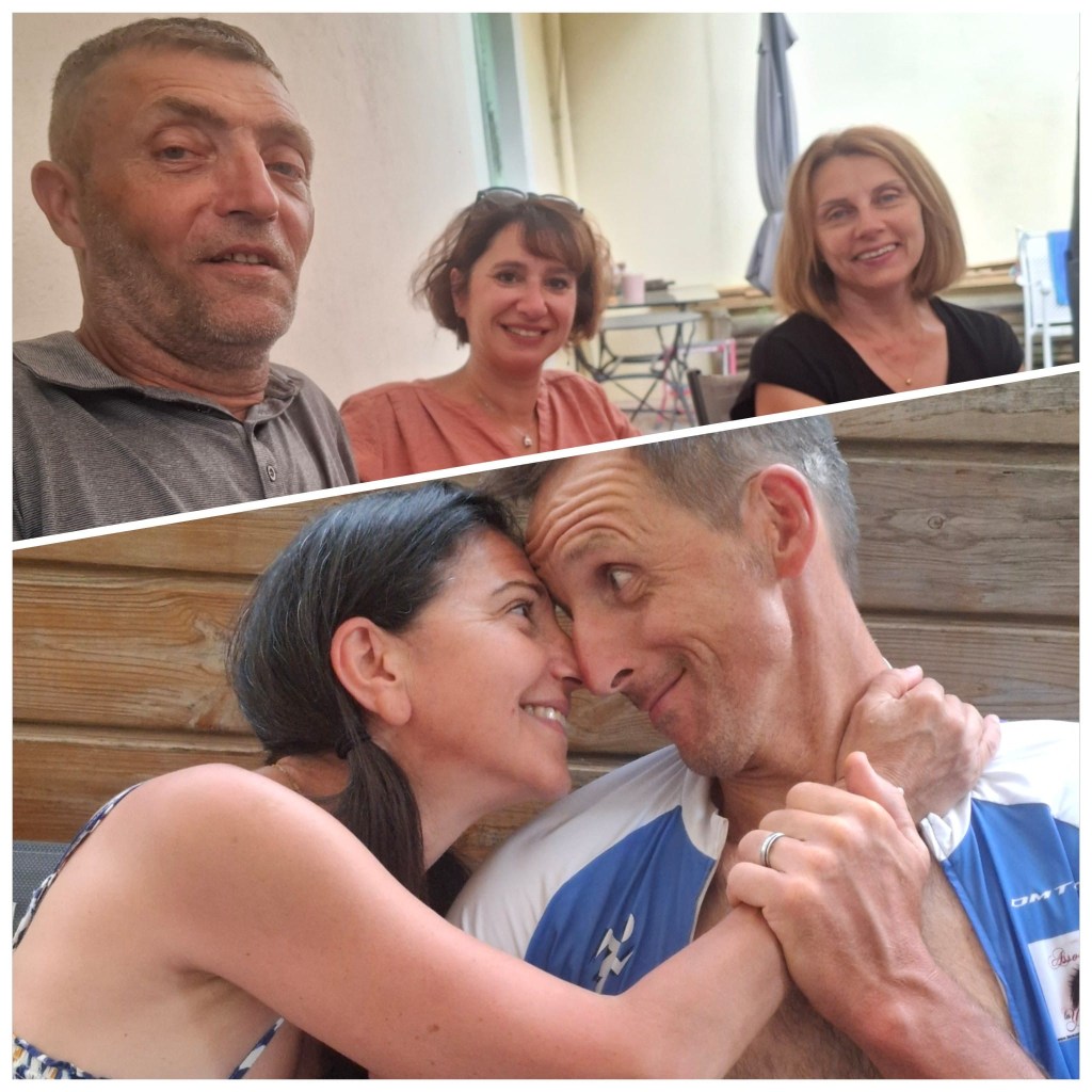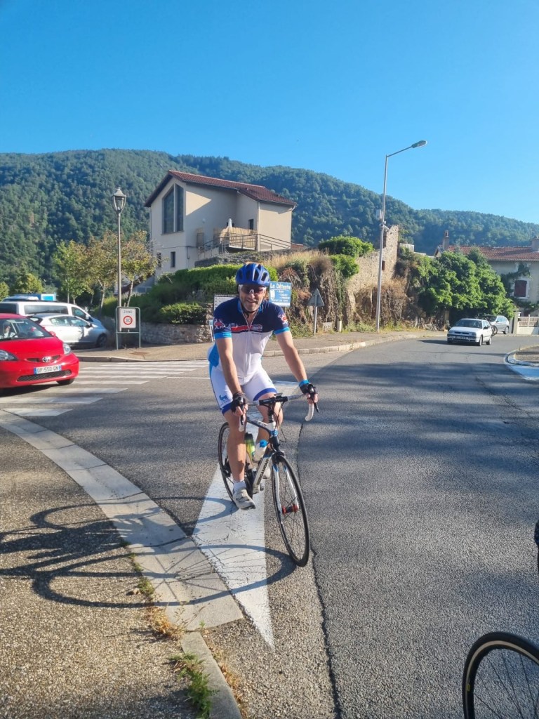 Nous partageons une petite coupe de champomy avec un petit boudoir, cadeau de mes parents et nous revoilà à nouveau sur les routes chevauchant nos machines vélocypédiques. Passage au pays du célèbre cuisinier Marcon: St Bonnet le Froid, puis Pont Salomon où nos routes se séparent avec celle de mes parents. Riotord et dernière bosse qui nous mènera jusqu’à St Ferréol d’Auroure et la descente vers Firminy et Fraisses pour un retour à la case départ où nous attendent tous ces amis qui nous sont chers. Quelle émotion de revoir mon vieux barbu et sa belle italienne, mais également Sylvie et Chrystelle et Pascale
