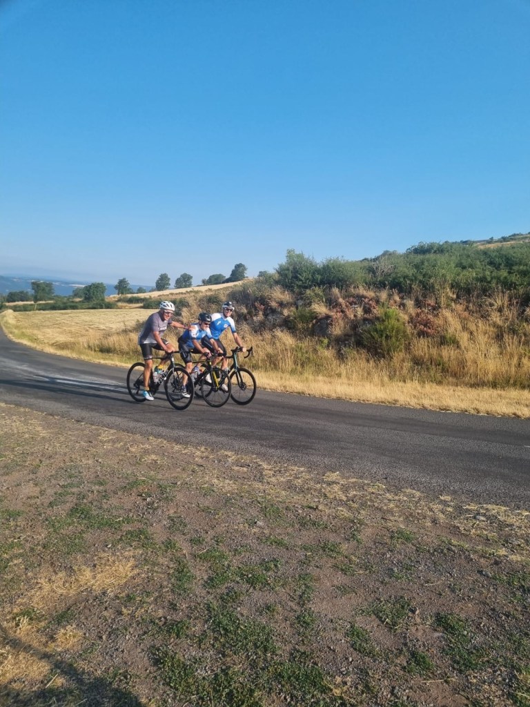 Après une bonne douche, un apéro au soleil et un repas copieux, chacun regagne sa chambre pour le repos du guerrier mérité. Nous sommes un peu à l’étroit dans nos chambres et lits. Malgré tout j’arrive à trouver rapidement le sommeil et dors d’un sommeil de l’enclume. Je me lève sans trop de courbatures, prêt à en découdre avec la dernière étape qui sera à coup sur la plus belle. Avant tout nous prenons notre petit déjeuner et quittons St Haon. Le début est une légère côte, et rapidement nous montons sur les plateaux altiligériens. Et là quelle émotion. Les paysages me rappellent mon Sancy et par autres endroits mes Combrailles. Je pense alors à mes grands parents maternels et à mes grands parents paternel. A ce grand père qui dès le plus jeune âge m’a fait découvrir le vélo. Ce grand père qui me grondait car je freinais dans les descentes, qui à chaque fois qu’il y a un orage me fait penser à lui, suite à un orage que nous avions pris, tiens: un 14 juillet. Et quel jour sommes nous? le 14 juillet; la boucle semble être bouclée.