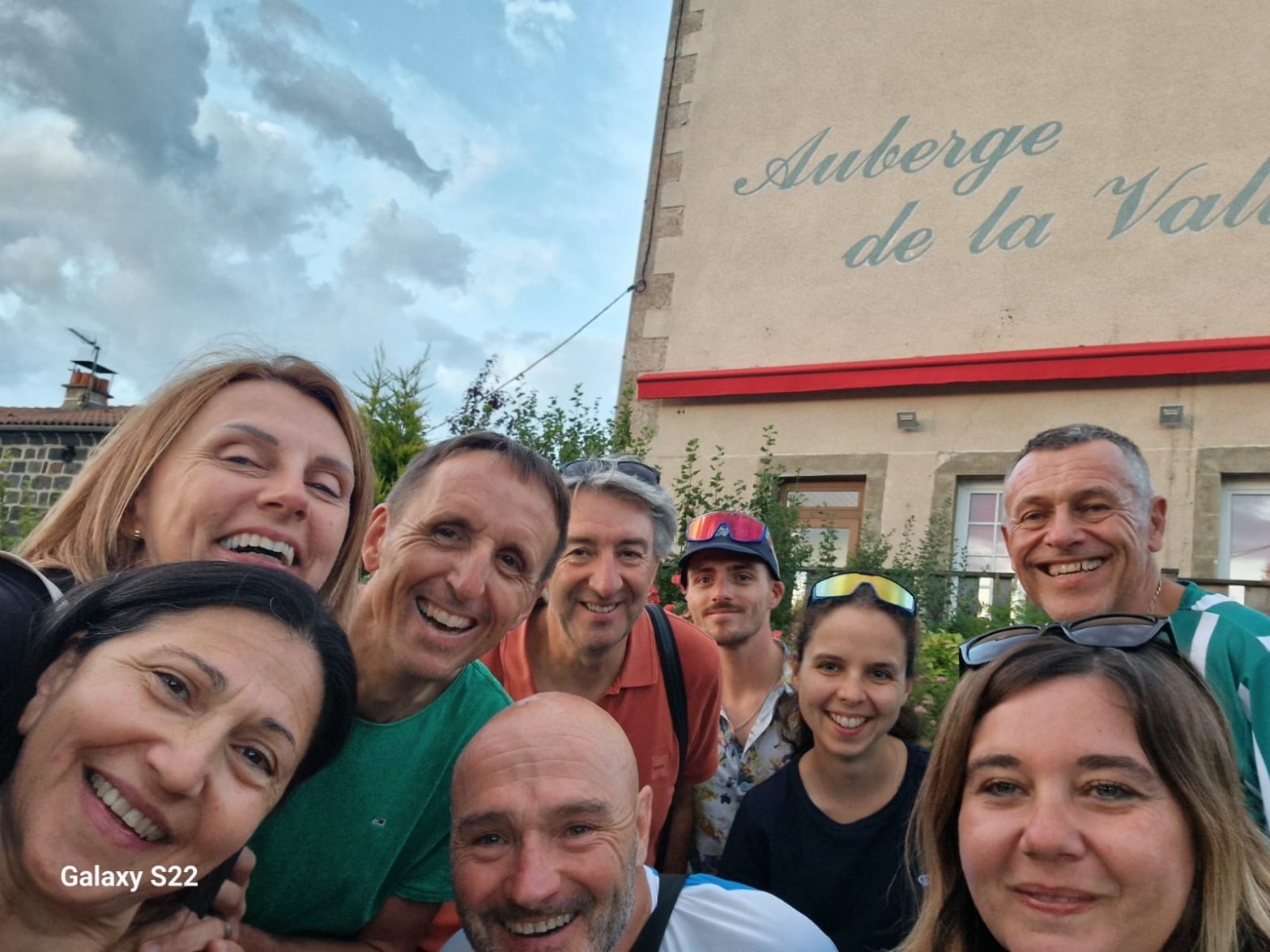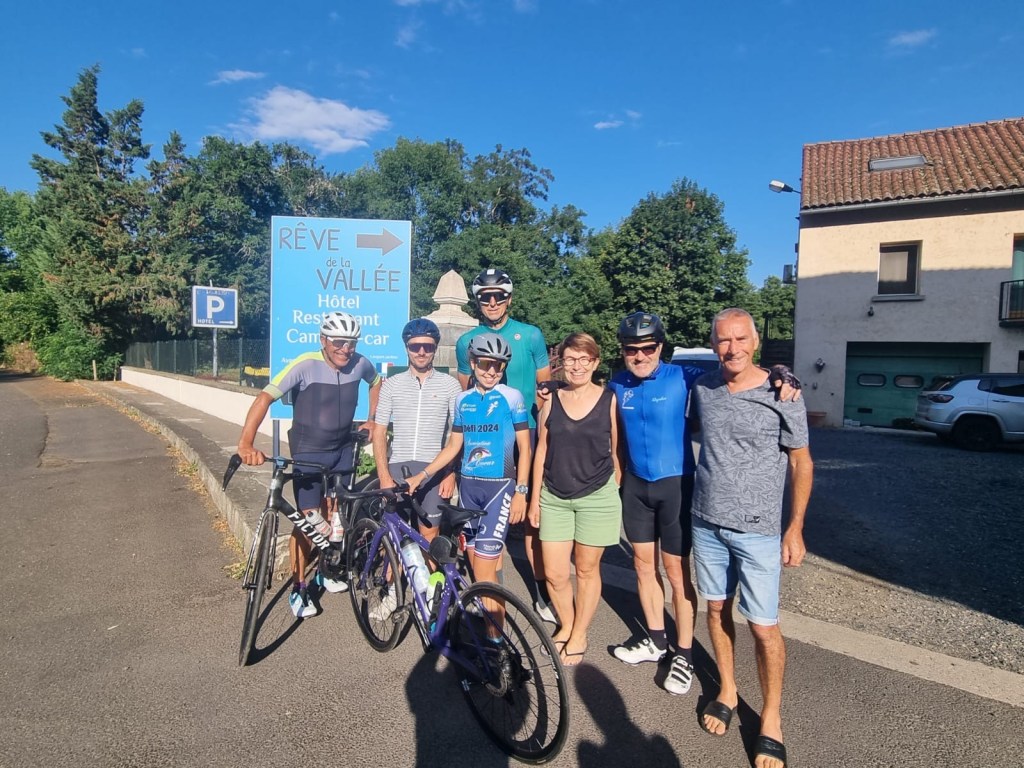 Passage incontournable à La Voulte Chilhac où Sylvie et Marc nous ont rejoint. Après la pause déjeuner pris dans un joli coin de verdure, nous repartons et c’est dur, mais petit à petit les sensations vont revenir au bon moment et heureusement, car au détour d’un virage, dans un petit village, l’itinéraire nous fait tourner à droite et une belle surprise nous attend: une côte de 2900m avec 300m de dénivelé et un goudron qui ne rend rien, avec en surplus des gravillons. Nous entamons ce calvaire et la route petit à petit se cabre pour atteindre les 24% avant de revenir à 14% pour les 500 derniers mètres. Ah ça pique! A 200m du sommet je vois mon Nico redescendre chercher Pierrot: quel courage ils ont tous les deux. Anaïs et Jean Yves ne sont pas et ne seront jamais très loin durant cette étape. Parfois ils seront même devant. Le reste de l’étape sera toujours un enchainement de cotes et descentes. Mais que la Haute Loire est belle! Finalement nous arriverons à destination sous la pluie. Nous sommes accueillis à l’auberge de la vallée à St Haon. Une auberge où de nombreux cyclistes viennent faire une pause tout au long de l’année. A tel point que l’ancien propriétaire à donner à ses chambres le nom d’ancien coureur. Pierrot hérite de la chambre Bernard Hinault, Jean Yves et Barbara de la chambre Poulidor, Nico et Anaïs de la chambre Anquetil, quand à ma chérie et moi nous dormirons dans la chambre d’Agostino (clin d’oeil à mon Francky)