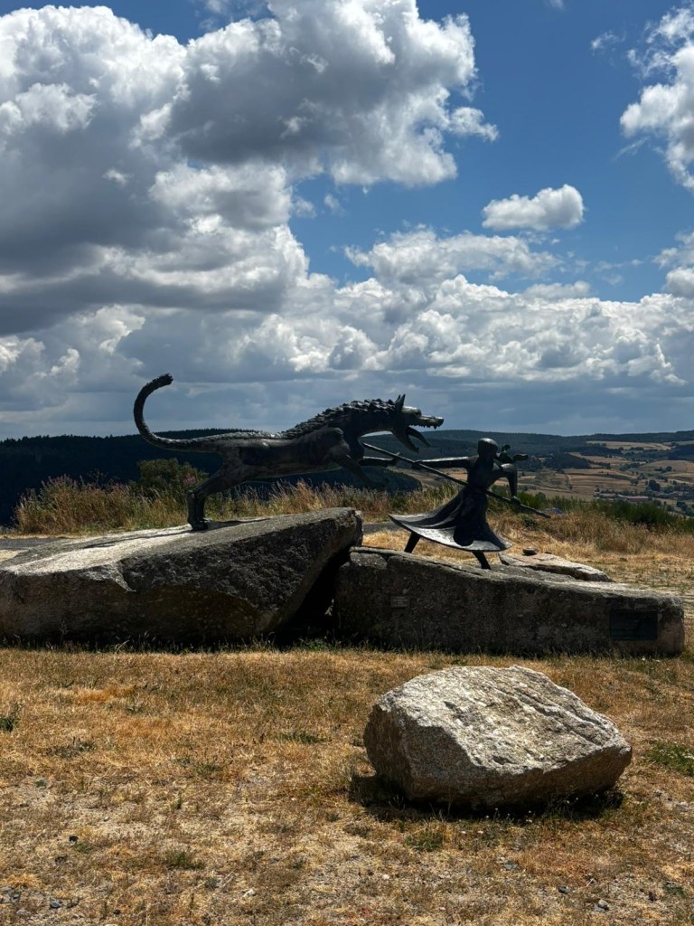 Nous fréquentons ces belles routes auvergnates, terres de culture et de contes et légendes. Nous passons aux Estables avant d’entamer la montée du Mont Mezenc. Ce n’est que du bonheur. Les paysages s’enchainent toujours aussi beaux et majestueux. Arrivés en haut Jyjy me dit punaise la dernière descente tapait fort, j’ai horreur de ça. A peine a-t-il dit cela que nous entamons la descente du point culminant de la Haute Loire. Et cette descente tape encore plus alors nous redoublons de prudence. Petite pause pour remplir nos bidons et téléphoner à mes parents qui doivent nous rejoindre pour que nous fêtions ensemble mon anniversaire. Et oui il a fallu que j’embête ma maman même le 14 juillet. Que de feux d’artifices ont été tirés à l’occasion de mon anniversaire. Mon papa ne pouvait que faire un révolutionnaire.