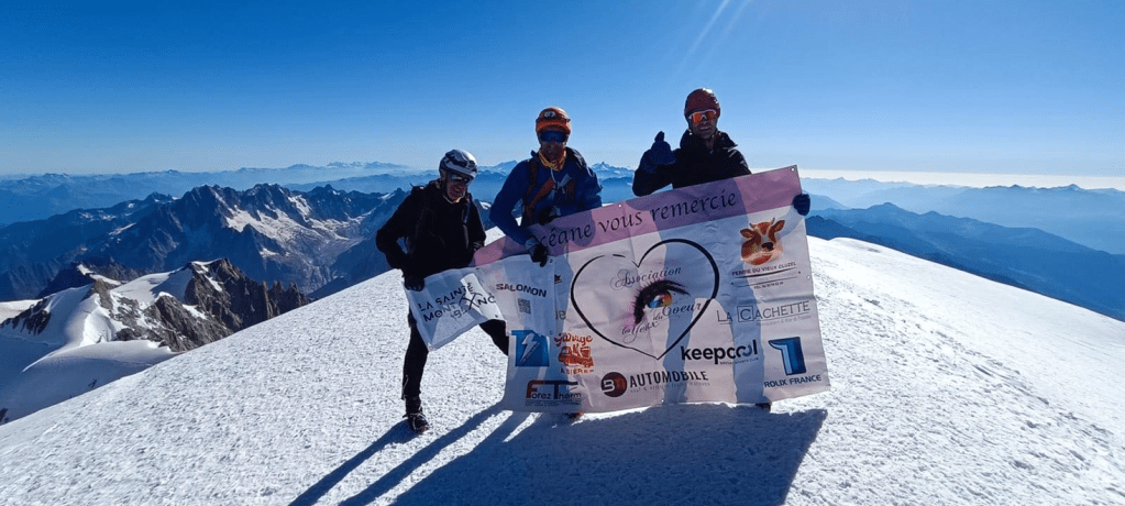 Rendez-vous était donné très tôt devant le Zenith: Mehdi, les deux Nico, Stef, Tony et moi partons pour près de 270km à vélo jusqu’à Bionassay près de St Gervais au Mont Blanc, lieu de départ de l’ascension du célèbre toit de l’Europe. Puis j’ai laissé mes accompagnateurs monter la banderole des Yeux du Coeur au sommet du Mont Blanc