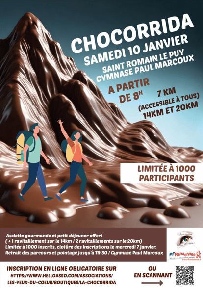 Bonjour à tous, Elle est là: l’affiche de la deuxième randonnée du chocolat: la chocorrida. Attention changement de date. Elle n’aura pas lieu le deuxième week-end de novembre comme l’année dernière, mais belle et bien le 10 janvier le jour de la corrida du pic. Alors n’hésitez plus une minute inscrivez-vous dès maintenant en scannant le qr code présent au bas de l’affiche ou en copiant et collant le lien ci-dessous dans votre moteur de recherche internet: https://www.helloasso.com/associations/les-yeux-du-coeur/boutiques/la-chocorrida